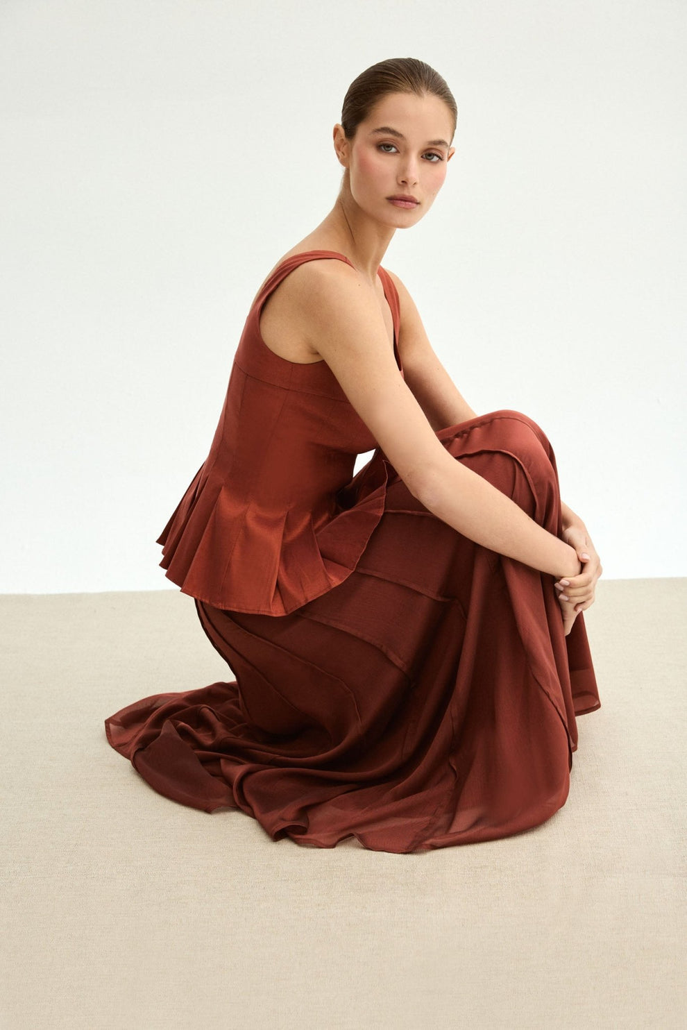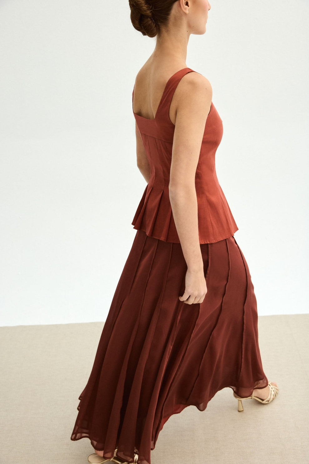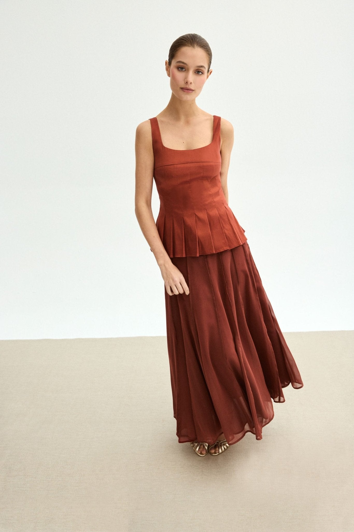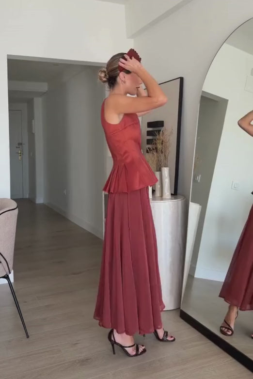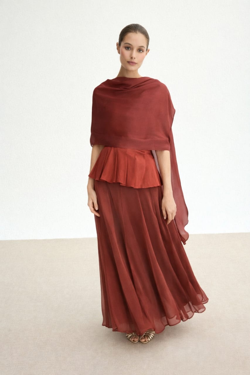 Este conjunto de tres piezas está compuesto por un top estructurado de líneas limpias y escote recto, que realza la silueta con delicadeza y aporta definición en la cintura gracias a su corte con ligero peplum plisado. La falda larga de caída vaporosa estiliza la figura y aporta movimiento envolvente en cada paso, creando un efecto fluido y refinado.