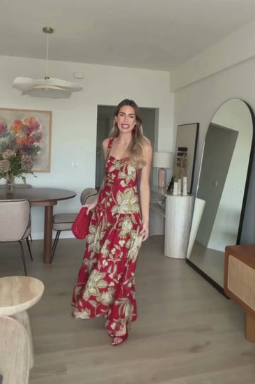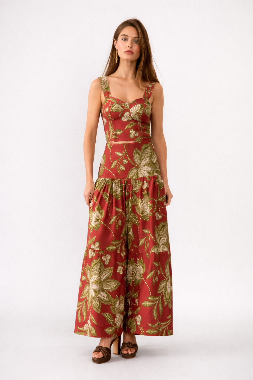 El Conjunto Chía es una propuesta sofisticada y femenina de dos piezas que combina diseño y elegancia en una silueta fluida y favorecedora. Pensado para ocasiones especiales, destaca por su estampado en tonos rojos y su aire romántico con un toque contemporáneo.