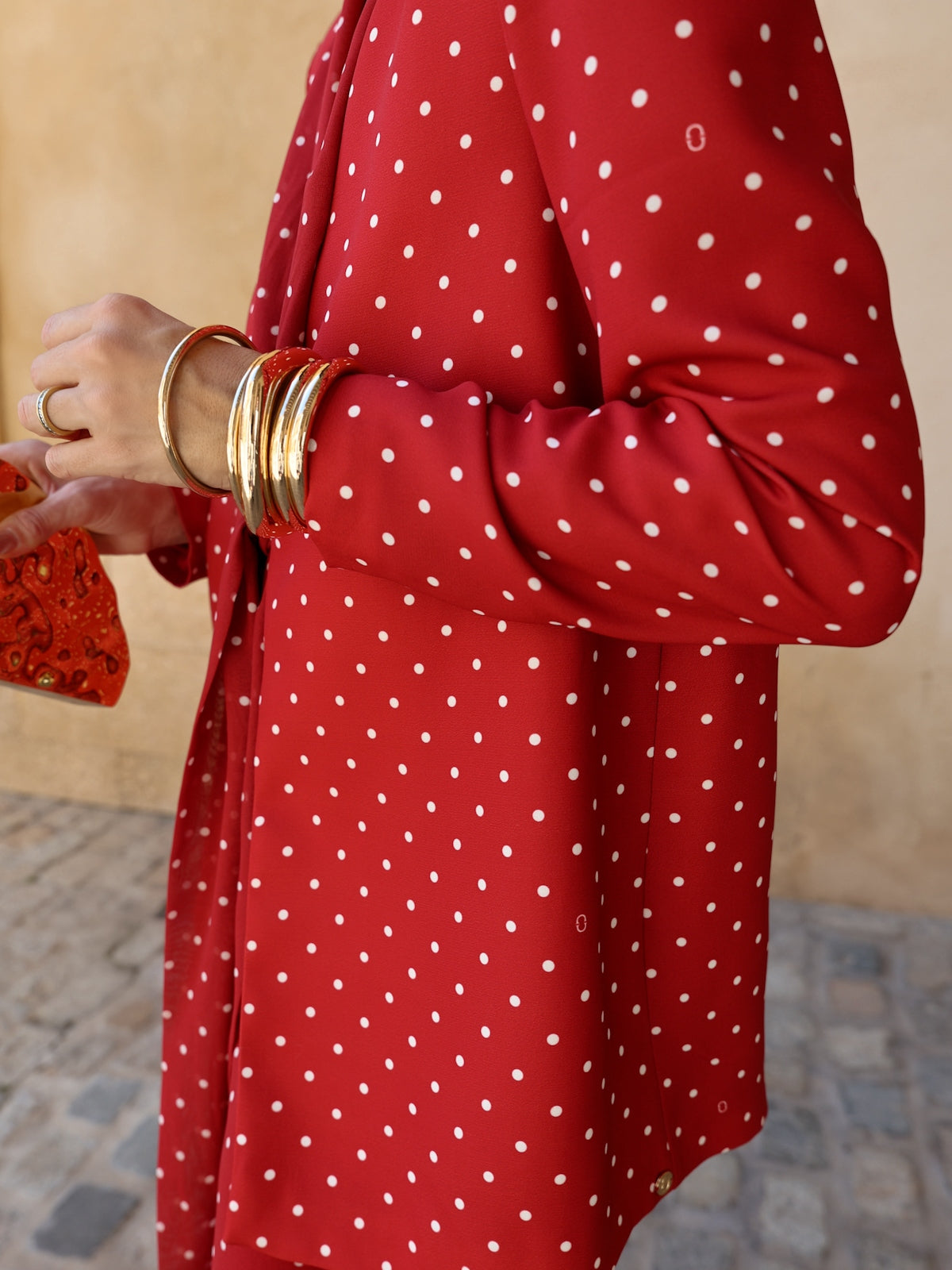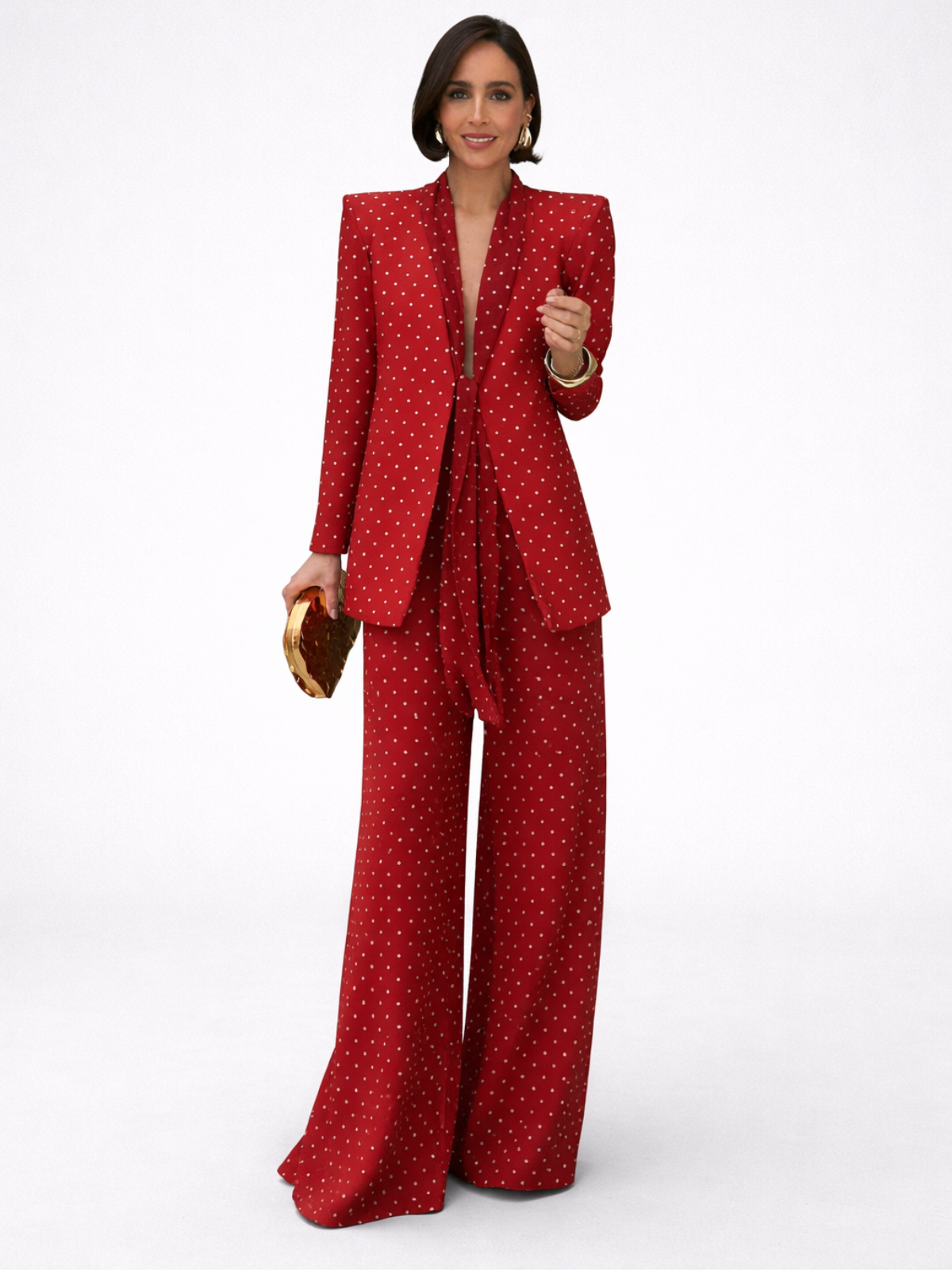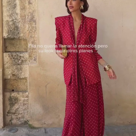 El diseño presenta una chaqueta de corte recto con hombreras estructuradas que aportan fuerza y definición a la silueta. Incorpora solapas de gasa multiposición, un detalle distintivo que permite jugar con diferentes estilos, desde un acabado más clásico hasta uno más fluido y original. El estampado de lunares en tono marsala y marfil, con el logotipo sutilmente integrado, añade personalidad y exclusividad al conjunto.