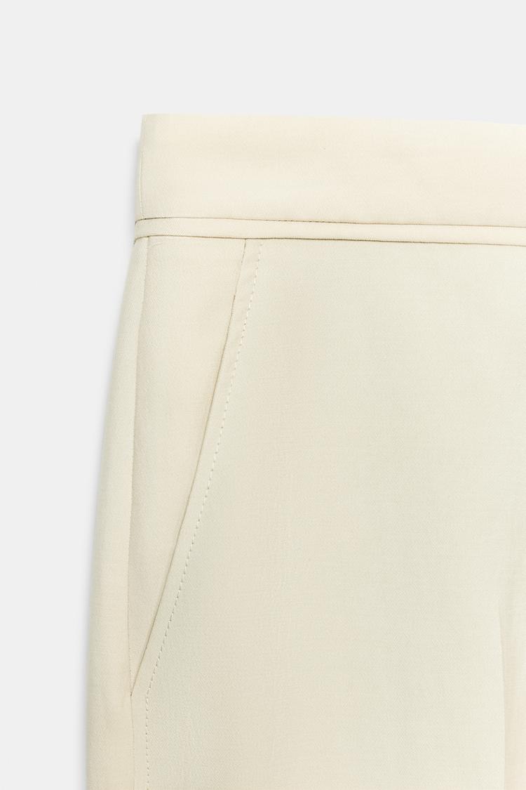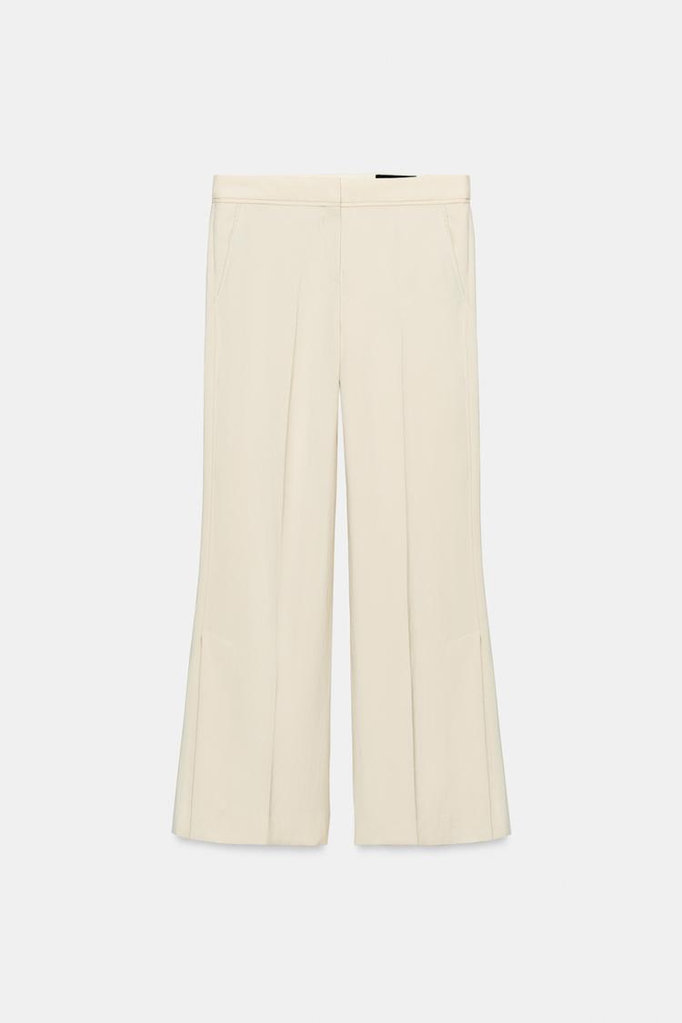 El pantalón de tiro medio completa el conjunto con una silueta de pierna ancha que alarga visualmente la figura. Incorpora bolsillos laterales y detalle de raya planchada, aportando estructura y sofisticación.