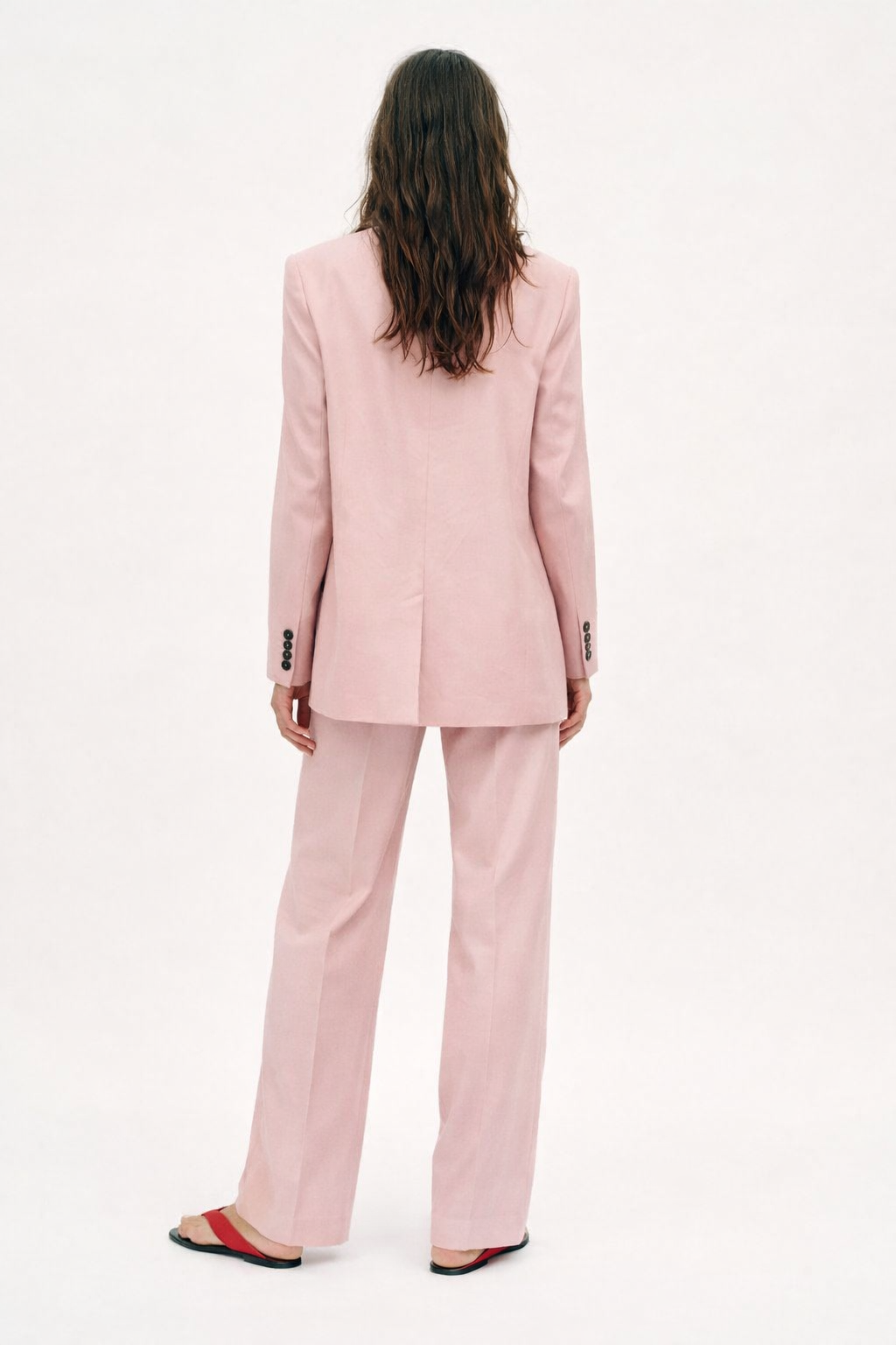 El pantalón de tiro medio completa el conjunto con una silueta de pierna recta ligeramente amplia que alarga visualmente la figura. Incorpora bolsillos laterales y detalle sutil, aportando estructura y elegancia. Un conjunto versátil que equilibra fuerza y feminidad en cada detalle.