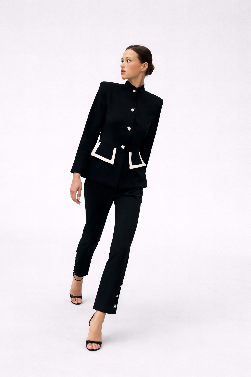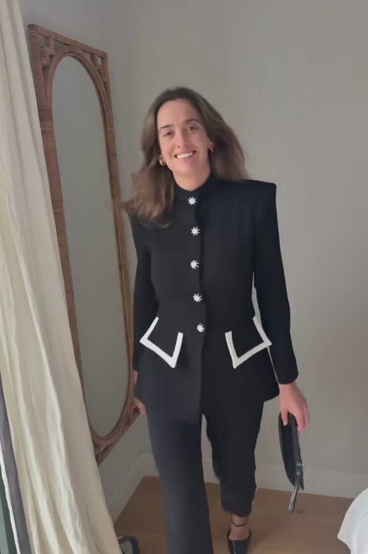 El pantalón largo de corte pitillo se adapta a la figura realzando la silueta, mientras que los botones laterales aportan un detalle moderno y sofisticado. La chaqueta de manga larga completa el conjunto con una estética estructurada, incorporando hombreras que aportan carácter, cierre delantero abotonado con cuello perkins y bolsillos a contraste que añaden un toque distintivo al diseño.