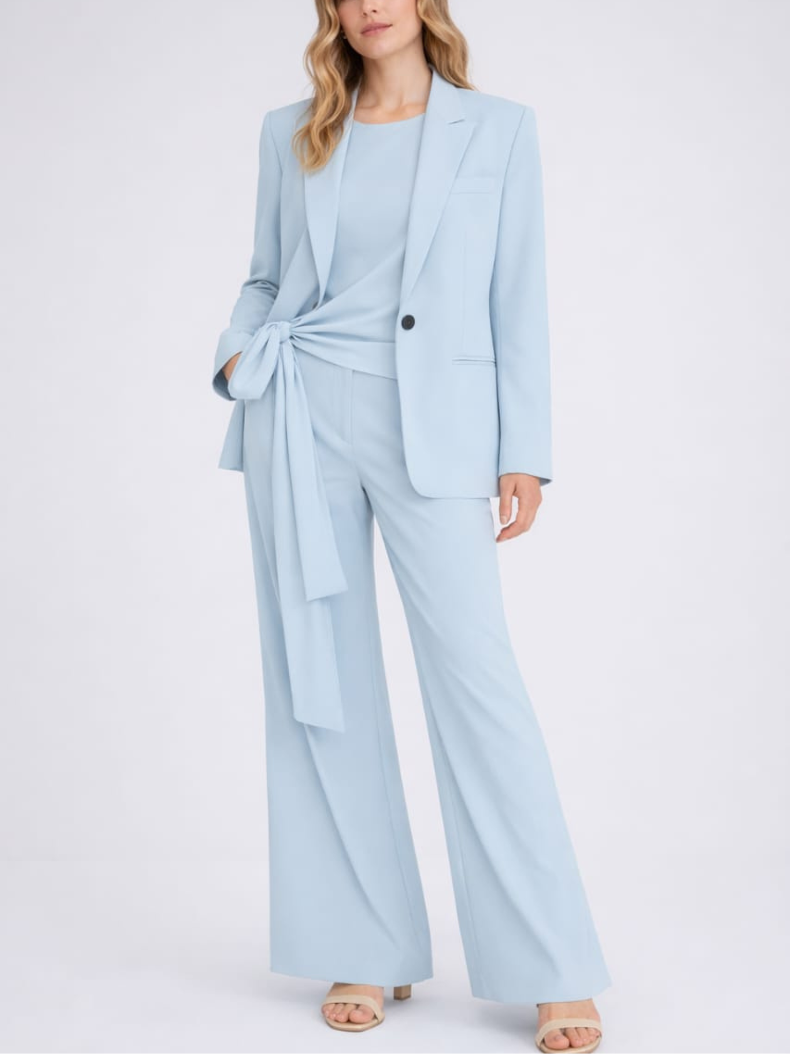 La chaqueta entallada con solapas de pico completa el conjunto aportando estructura y equilibrio al look. Los bolsillos de ribete en la parte delantera y en el pecho, junto con el cierre frontal con botón, refuerzan su estética elegante y atemporal. Las mangas largas con puños abotonados añaden un acabado pulido y sofisticado que eleva el conjunto.