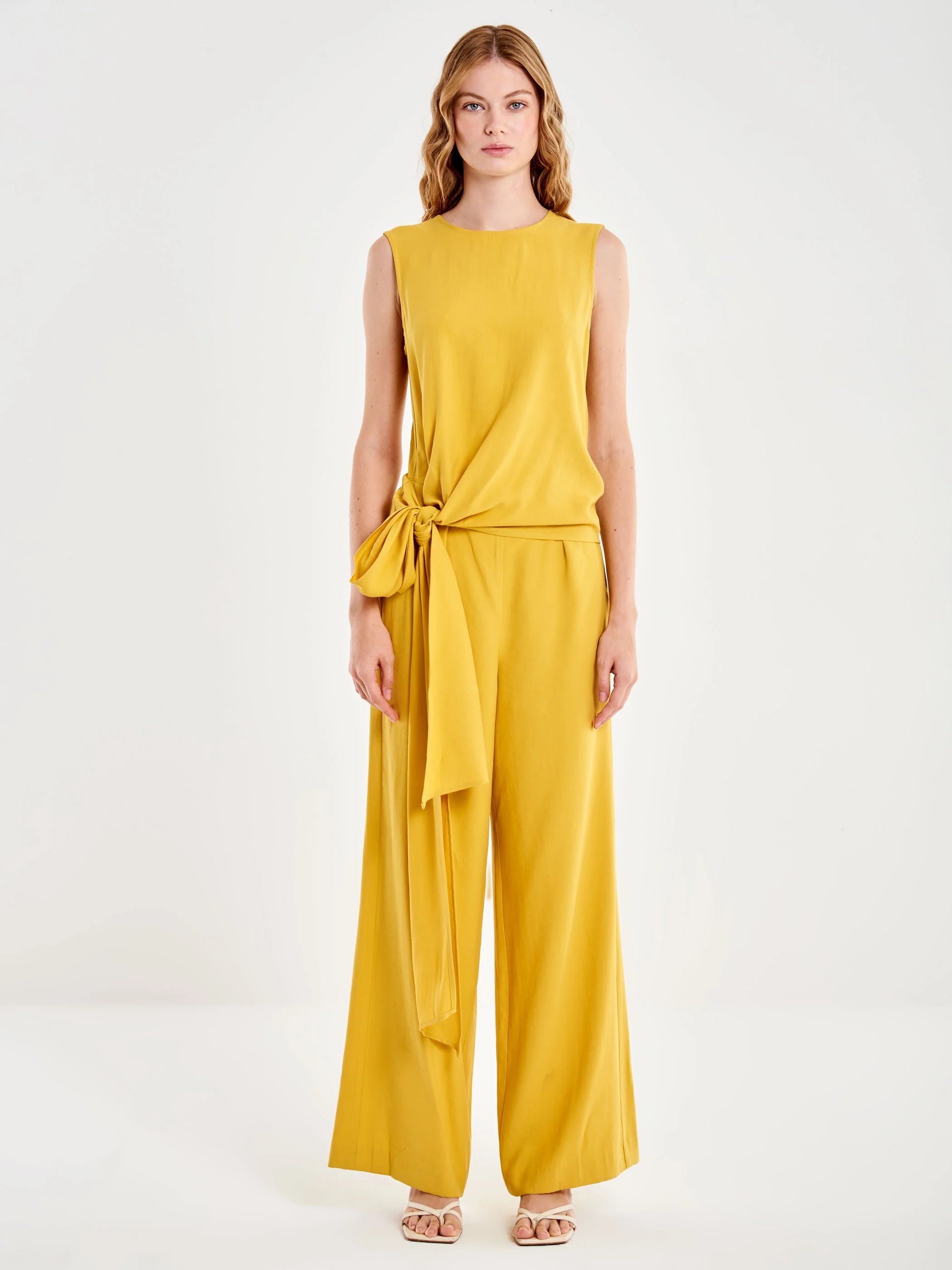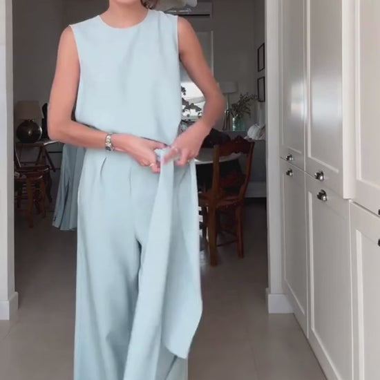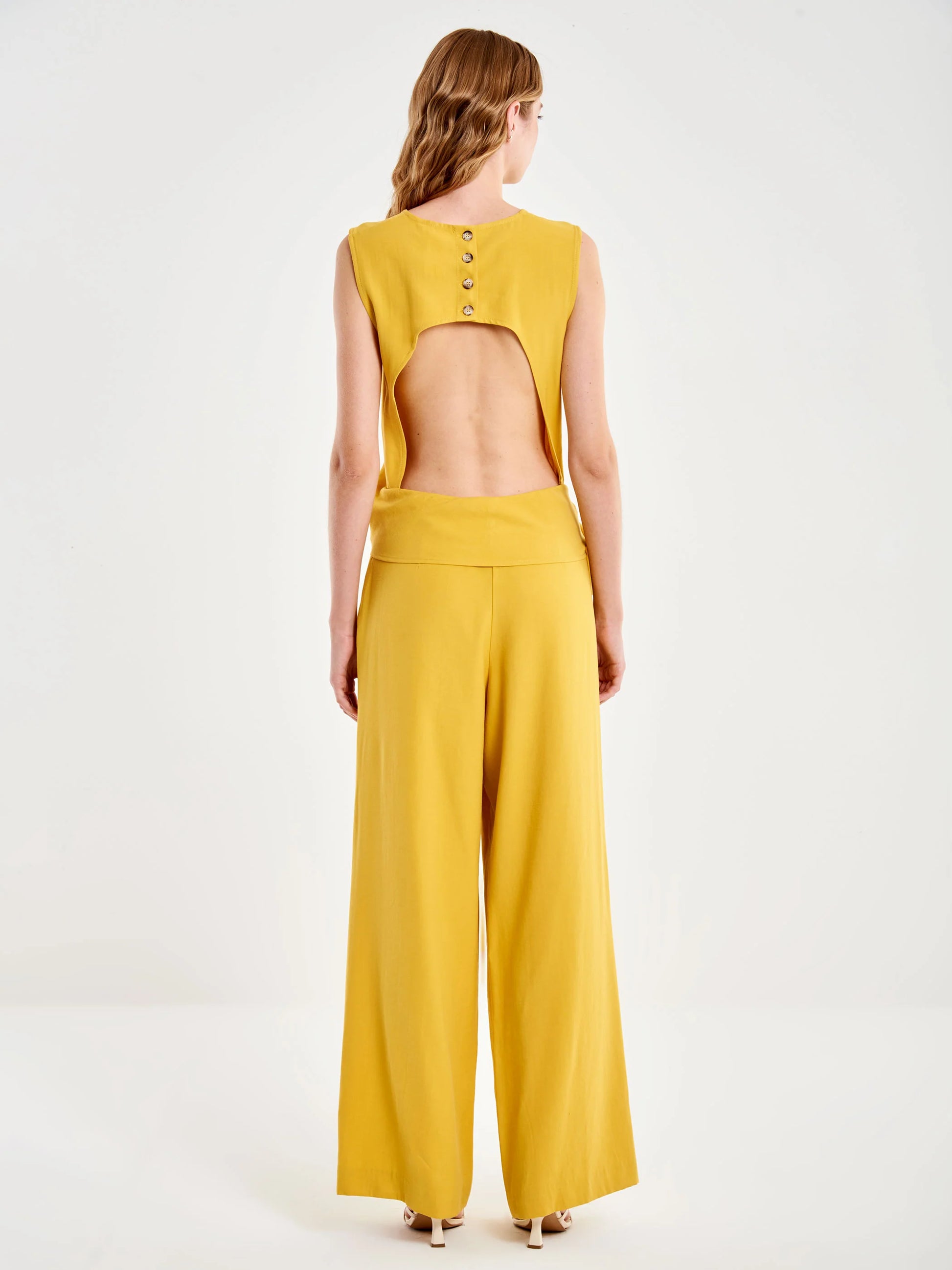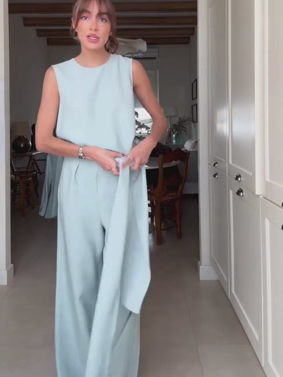 El mono sin mangas presenta un cuello redondo limpio y elegante, acompañado de un detalle de lazo delantero que aporta movimiento y un toque femenino al diseño. En la parte posterior, la prenda revela una espalda abierta que añade carácter y sofisticación, mientras que el cierre trasero con botones y cremallera lateral invisible garantiza un ajuste cómodo y discreto que mantiene la pureza de la silueta.