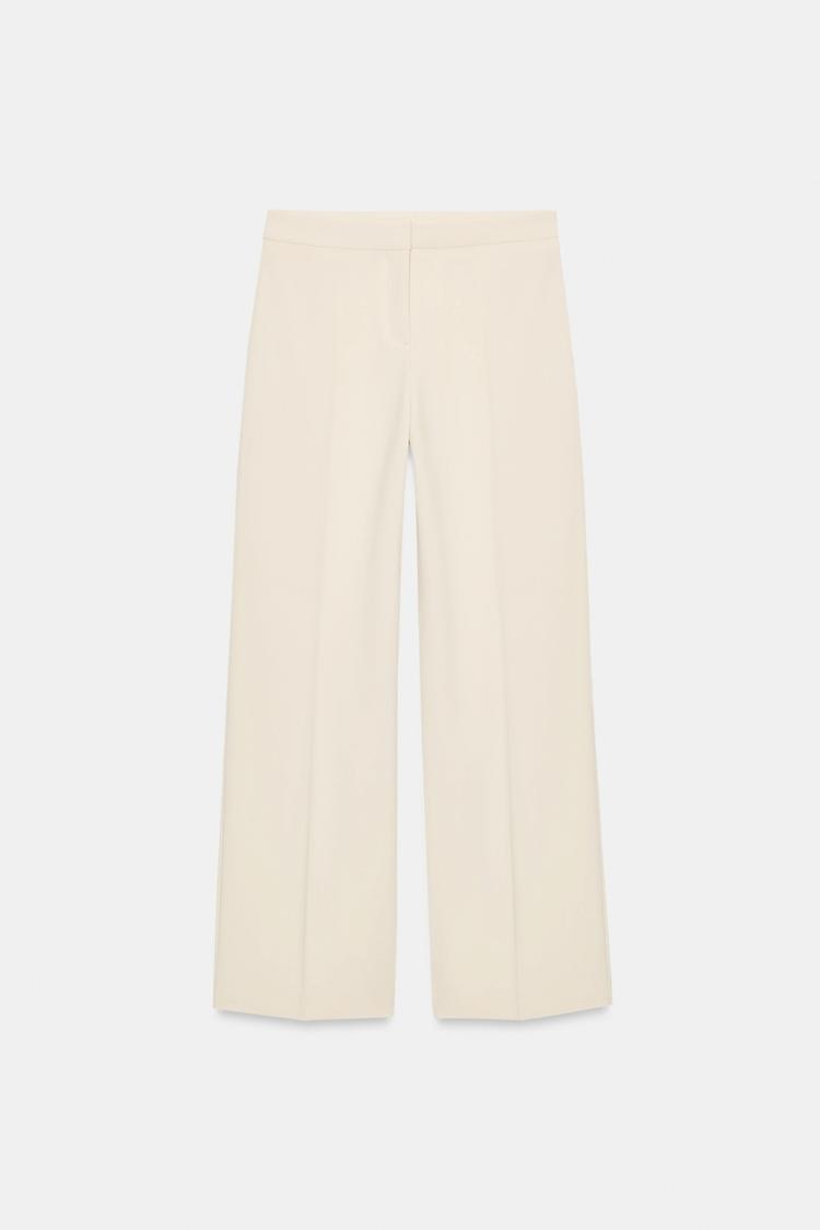 El pantalón de tiro alto complementa el conjunto con una silueta recta y elegante que alarga visualmente la figura. Su confección estructurada y su caída fluida aportan un acabado refinado, mientras que el cierre frontal con cremallera, botón interior y gancho asegura un ajuste limpio y preciso.