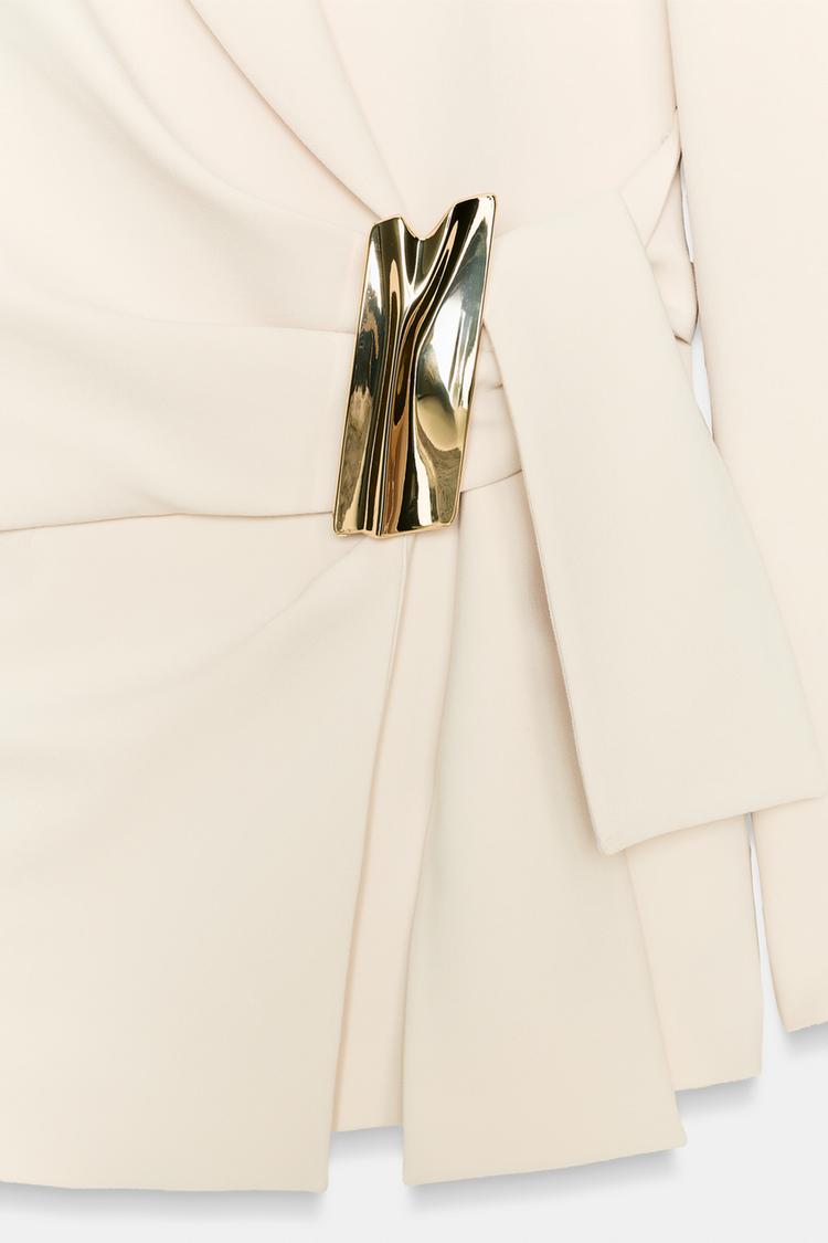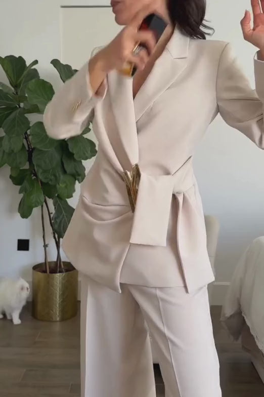 El blazer, de cuello solapa y manga larga con hombreras, presenta una silueta entallada que define la figura con elegancia. Los bolsillos laterales ocultos en la costura mantienen una apariencia limpia y depurada, mientras que el detalle de hebilla dorada en la parte frontal aporta un toque distintivo y sofisticado que eleva el diseño. El cierre cruzado con botón a presión oculto y lazada crea un efecto envolvente que estiliza la cintura, mientras que la abertura en la parte posterior del bajo aporta comodidad y libertad de movimiento.