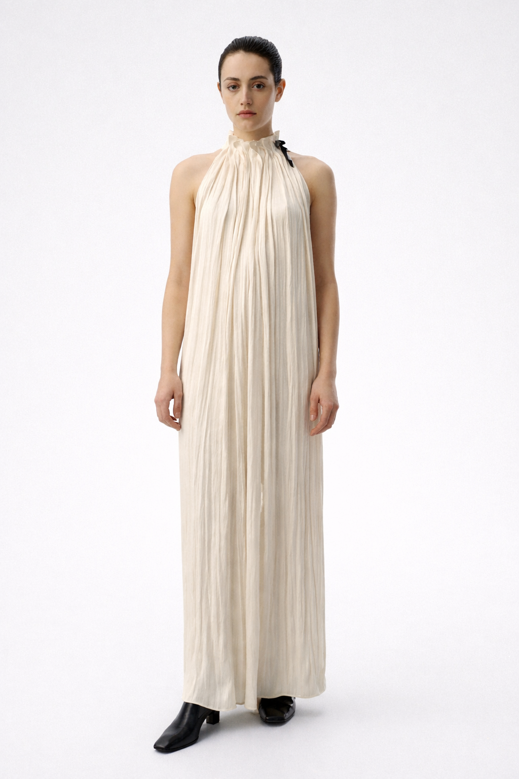 El diseño presenta un escote redondo y manga sisa que aportan equilibrio y limpieza visual, mientras que el detalle de lazo a contraste en el cuello añade un toque distintivo y delicado que eleva la prenda. Incorpora cierre en la espalda mediante abertura con botones, garantizando un ajuste cómodo y elegante.