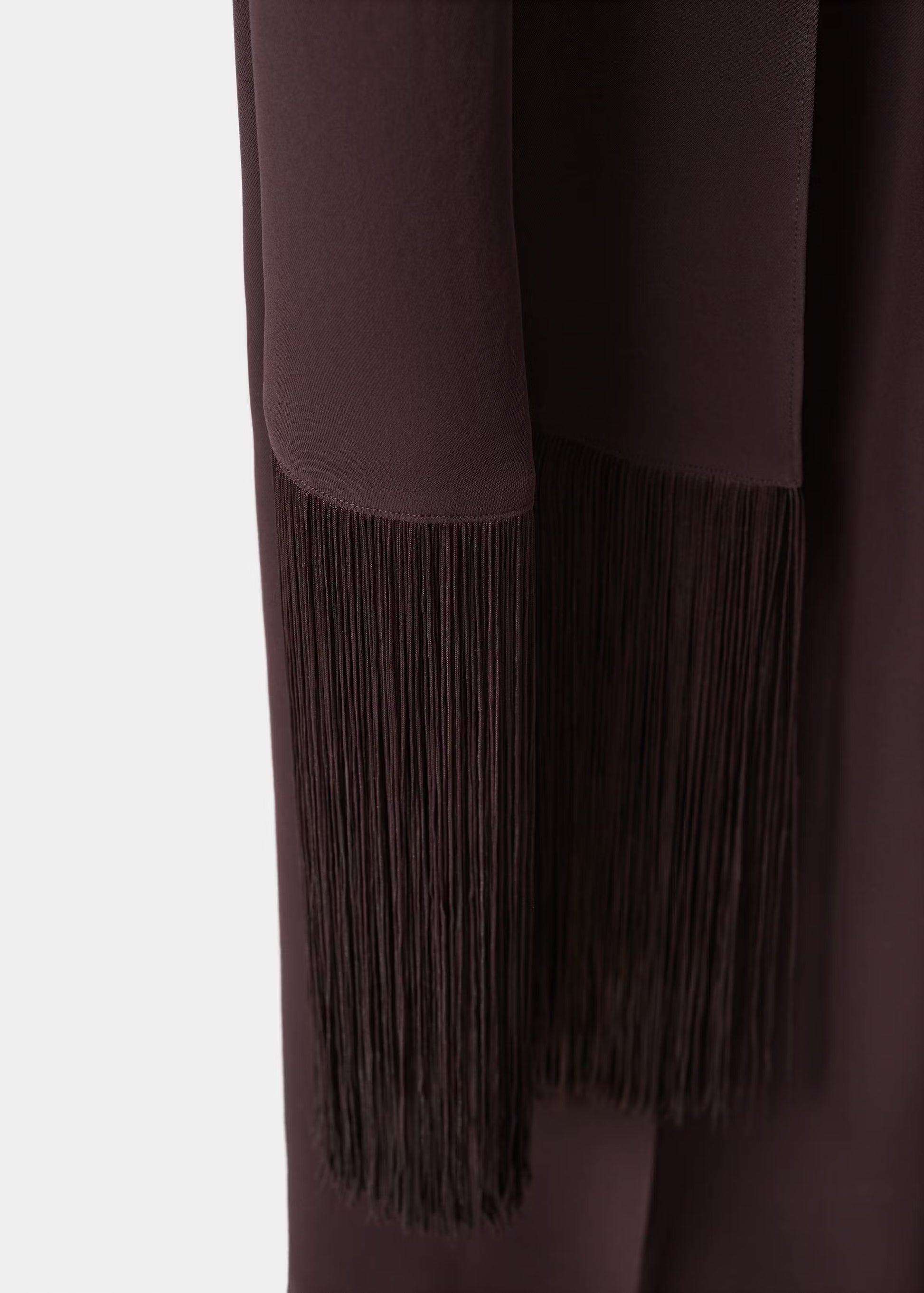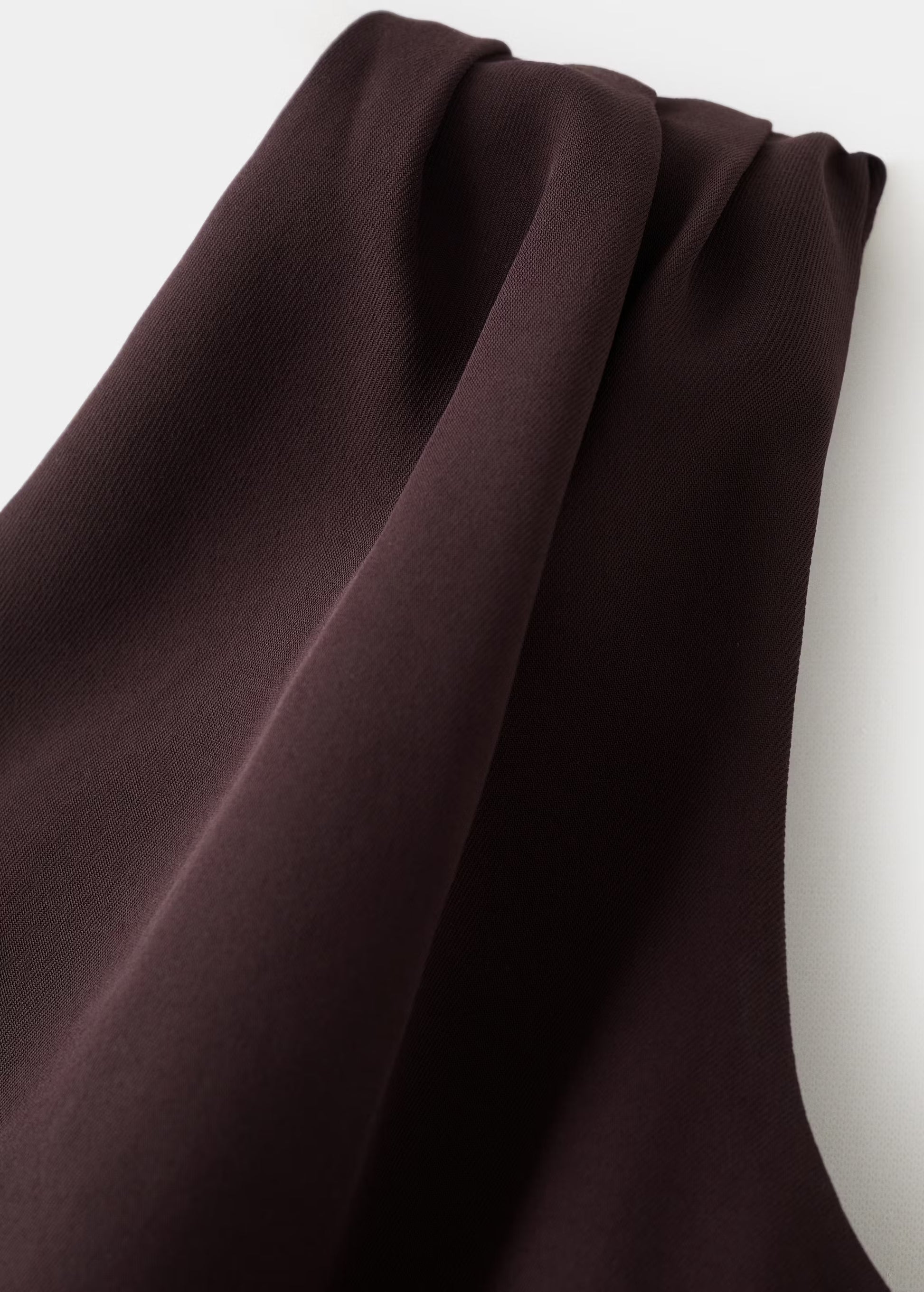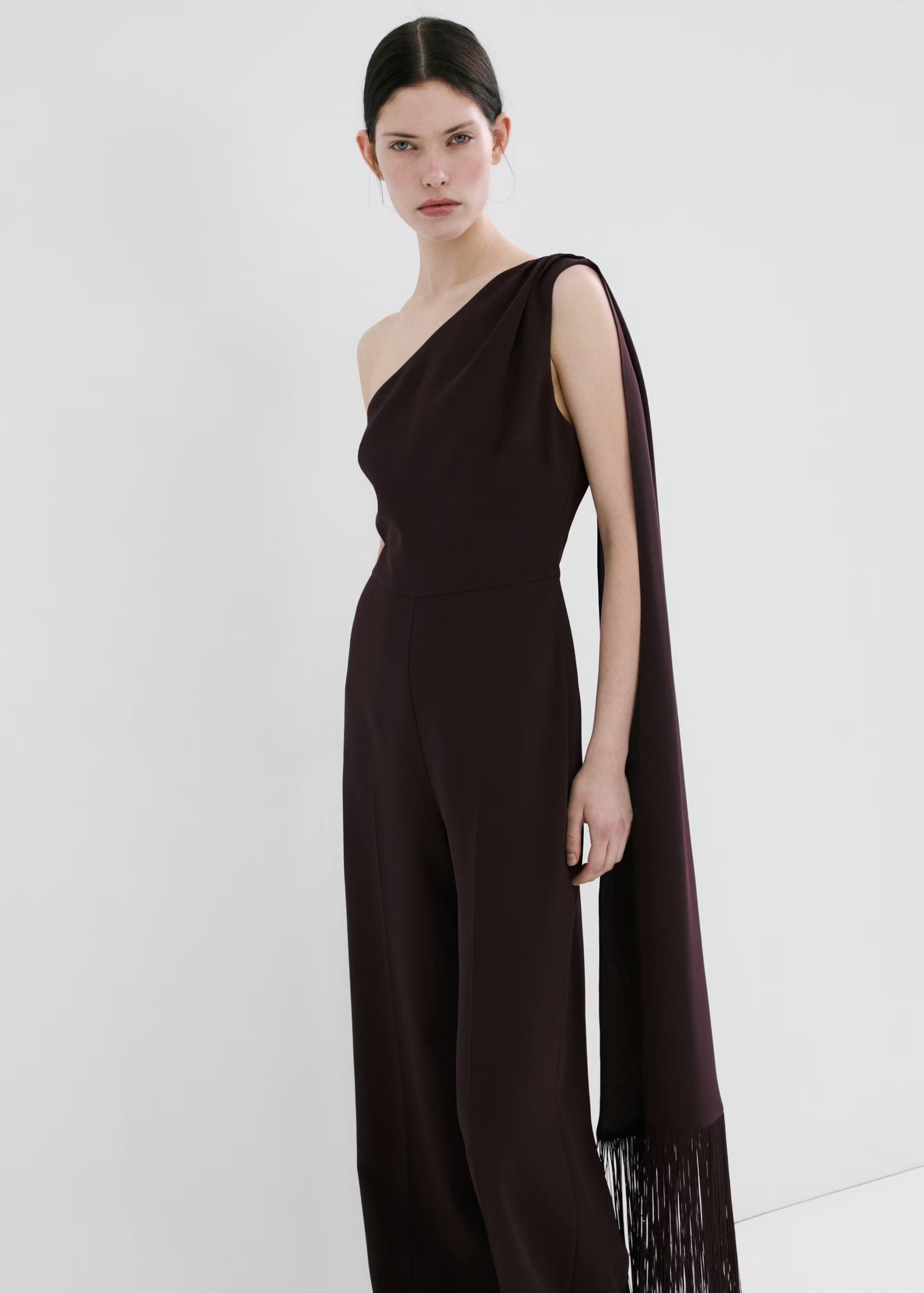 El diseño largo con corte asimétrico aporta un enfoque actual y distintivo, mientras que el detalle de fular en el cuello introduce movimiento y un acabado refinado que realza la parte superior. La silueta estilizada alarga visualmente la figura, creando un efecto elegante y favorecedor con una estética limpia y equilibrada.