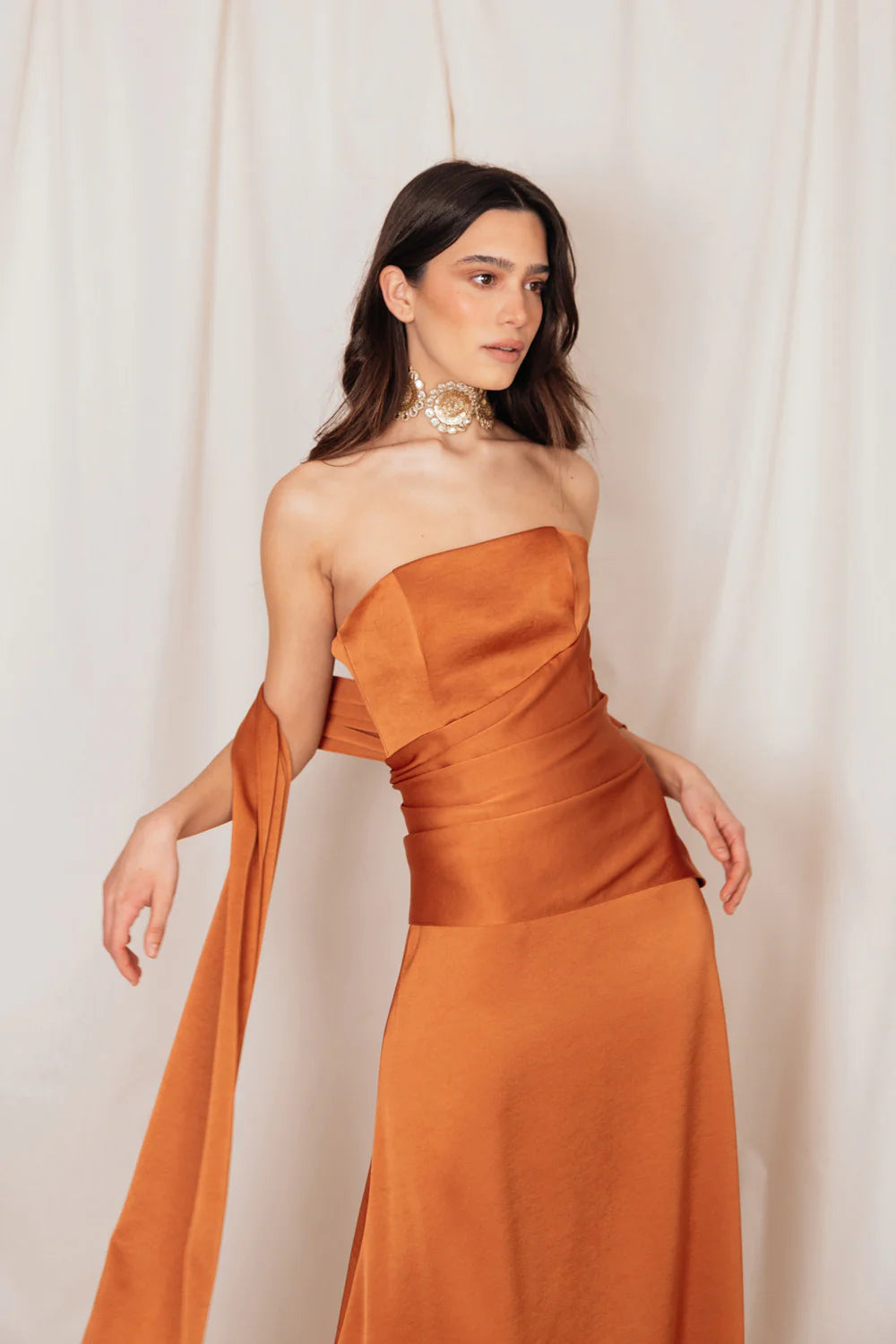 El diseño incorpora lazos que nacen desde la cintura, tanto en la parte delantera como en la trasera, permitiendo llevar el vestido de distintas formas: cubriendo los hombros o dejando el escote al descubierto. Este detalle transforma la prenda y le aporta un carácter dinámico, adaptándose fácilmente a diferentes estilos y ocasiones.