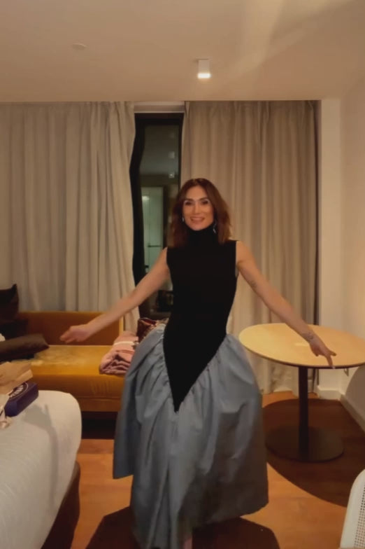 El diseño presenta un cuerpo de cuello alto y corte sin mangas que estiliza la figura y realza la línea de los hombros con una elegancia minimalista. Su ajuste ceñido se adapta al cuerpo con suavidad, mientras que el corte en pico en la cadera define la silueta y da paso a una falda de gran volumen, aportando un efecto visual moderno y favorecedor.