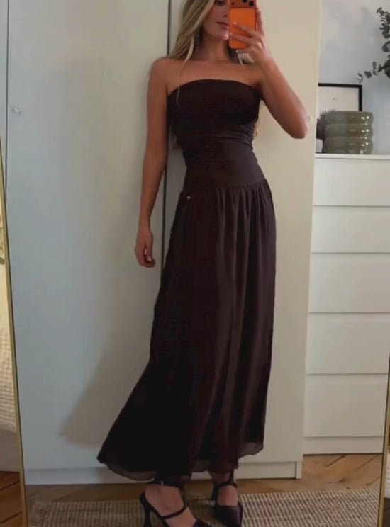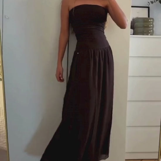 Su diseño maxi presenta un escote palabra de honor con banda de silicona interior que garantiza sujeción, junto a un favorecedor corte a la cadera (drop-waist) que estiliza la figura. Incorpora un detalle de pañuelo y espalda baja con lazada, aportando un toque distintivo y elegante, mientras que el cierre lateral con cremallera asegura un ajuste limpio.