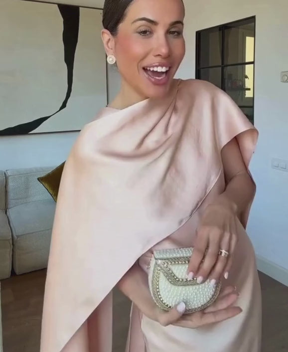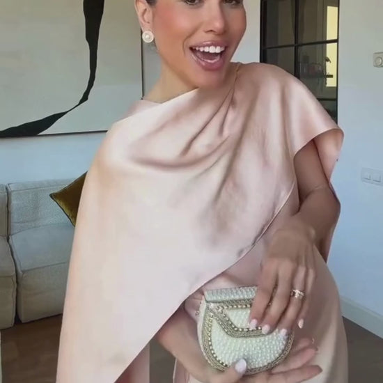 El Vestido Livorno es una propuesta sofisticada y atemporal que combina elegancia y fluidez en una silueta femenina y estilizada. Pensado para ocasiones especiales, destaca por su acabado satinado en tono rosa claro, que aporta un brillo sutil y un aire refinado.
