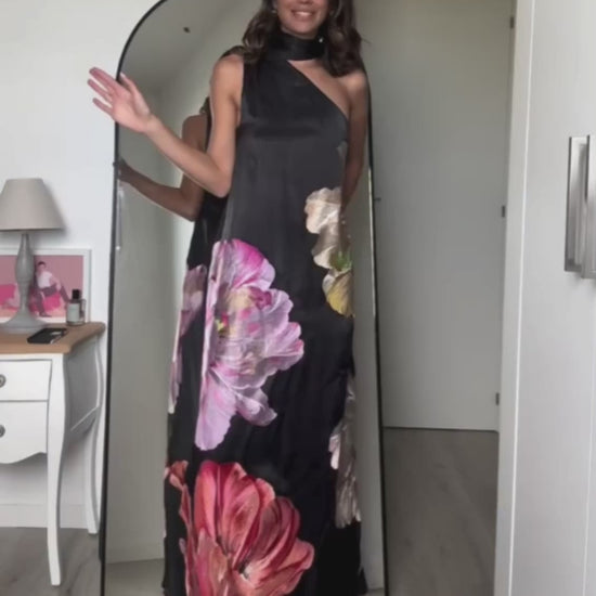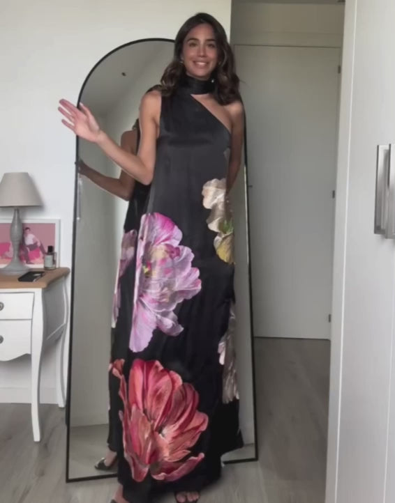 El escote halter con cuello alto realza la parte superior con un acabado refinado, mientras deja los hombros al descubierto aportando equilibrio y sofisticación. El bordado floral extragrande se convierte en el elemento protagonista, aportando un impacto visual único y un toque artístico que eleva la prenda. El detalle de fular añade movimiento y ligereza, creando una caída fluida que acompaña cada paso con elegancia.