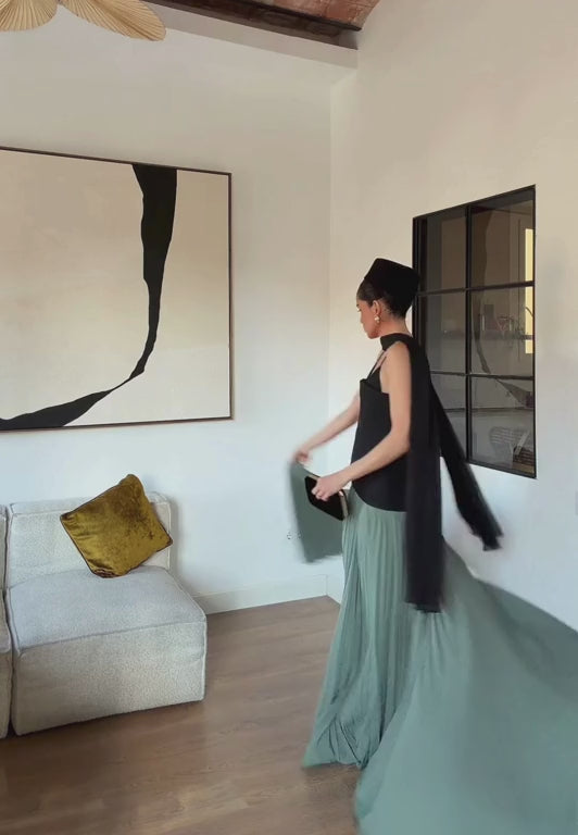 La falda larga plisada añade movimiento y ligereza al conjunto, creando una caída fluida y sofisticada al caminar. El Vestido Trinidad es una opción perfecta para bodas, celebraciones y eventos especiales, donde destacar con un estilo femenino, elegante y atemporal.